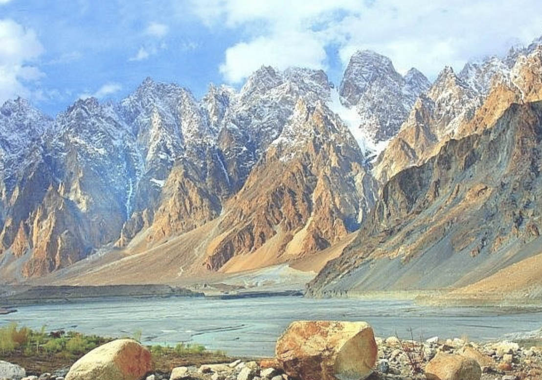 North of Karimabad, the Passu region is famous for its distinctive conical shapes, which are sharp peak formations that appear like pencil sketches. It involves much more of an excursion rather than an ascent to reach the Passu Glacier. It starts right next to the Passu Suspension Bridge, which is an adventure within itself for young children who like the idea of walking across a wooden structure.